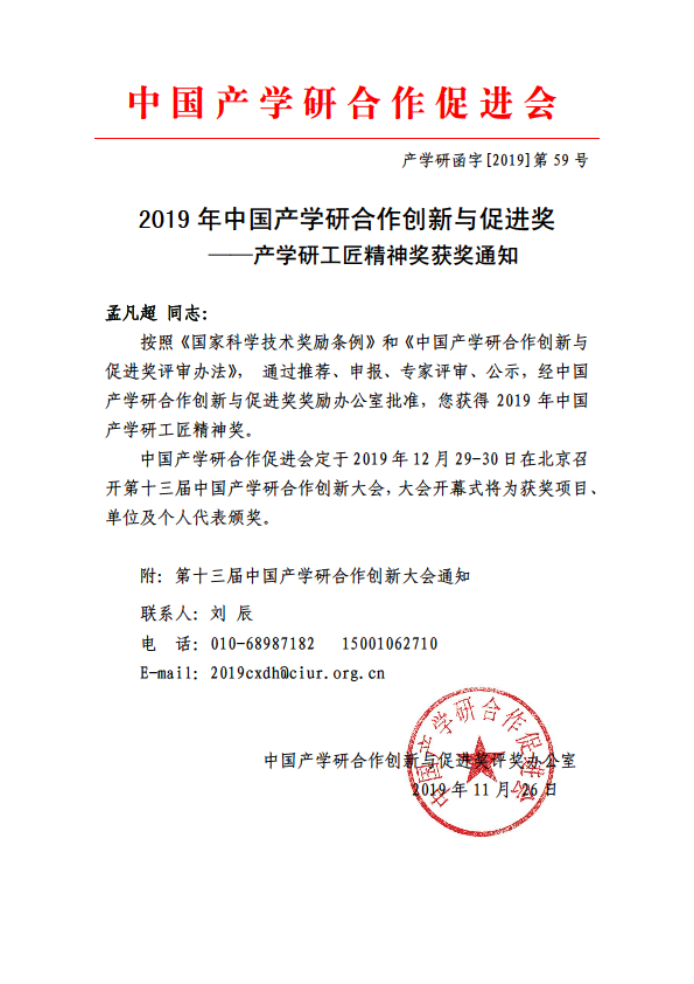 近日,接中国产学研合作促进会《2019年中国产学研合作创新与促进奖——产学研工匠精神奖获奖通知》(产学研函字[2019]第59号),经老伟德网上娱乐推荐,中国产学研合作创新与促进奖奖励办公室批准,我校杰出校友孟凡超获得2019年产学研工匠精神奖。
