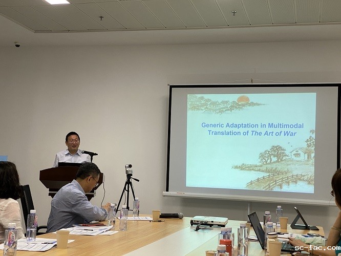 外国语学院罗天教授做了题为“Multimodal Translation of The Art of War: A Genre Perspective”的大会报告。他以系统功能语言学专家马丁教授的语类理论为基础,对中国军事经典《孙子兵法》的多模态翻译进行个案研究,指出了“从单模态向多模态转换过程中存在语类杂合”等问题。此后,罗天教授还主持了第五场大会发言。