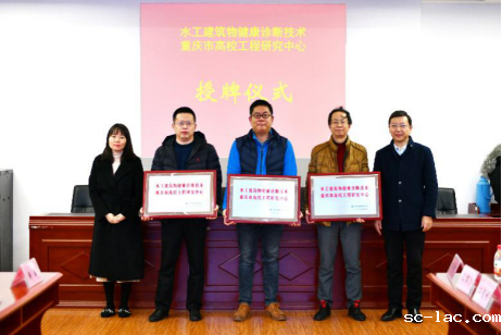 会议分三阶段举行。第一阶段为工程研究中心管理委员会会议,由科技处副处长彭凯主持。副校长赵明阶代表学校致欢迎辞,重庆市教育委员会科技处调研员王洒宣读了“重庆市教育委员会关于同意水工建筑物健康诊断技术与设备重庆市高校工程研究中心更名和调整共建单位的批复(渝教科函[2019]7号)”文件。随后,王洒调研员和赵明阶副校长共同为中心共建单位“重庆市水利电力建筑勘测设计研究院、中地装(重庆)地质仪器有限公司、长江水利委员会长江科学院重庆分院”授牌。