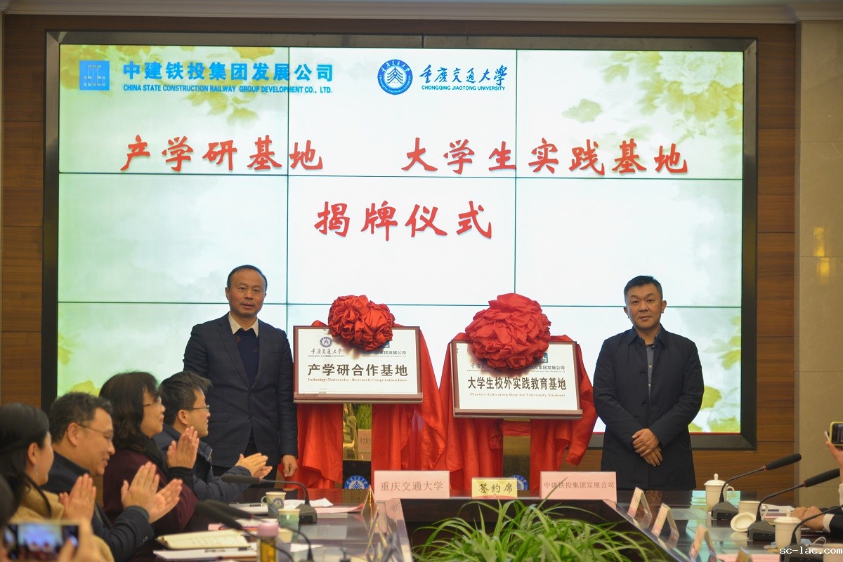 中建铁投集团发展公司党委书记、董事长、总经理兼重庆分公司董事长万超、副校长周建庭共同为“产学研合作基地”和“大学生校外实践教育基地”揭牌。