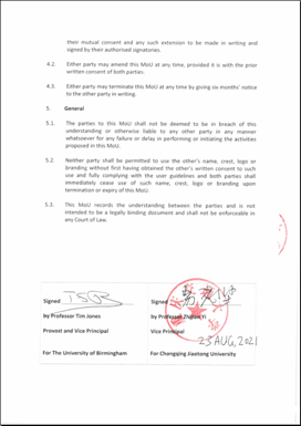 近日,我校副校长易志坚与英国伯明翰大学常务副校长Tim Jones分别代表两校签署校际合作协议。根据2022QS世界大学排名,英国伯明翰大学名列第90位,这是我校首次与世界排名前100的海外高校签署合作协议。另外,今年以来学校还先后与德国德累斯顿工业大学(2022QS世界大学排名194位)、比利时安特卫普大学(2022QS世界大学排名238位)等世界500强高校签署合作协议,学校的海外朋友圈数量和质量得到显著提升,也为70周年校庆献上了一份重要贺礼。