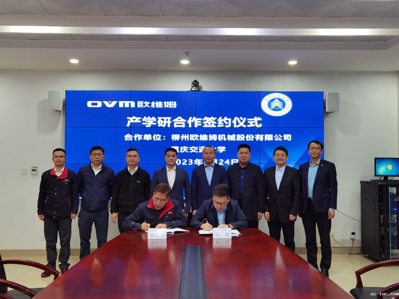 产学研合作处副处长吴磊、柳州欧维姆机械股份有限公司副总经理谢正元分别代表校企双方签署产学研战略合作协议。