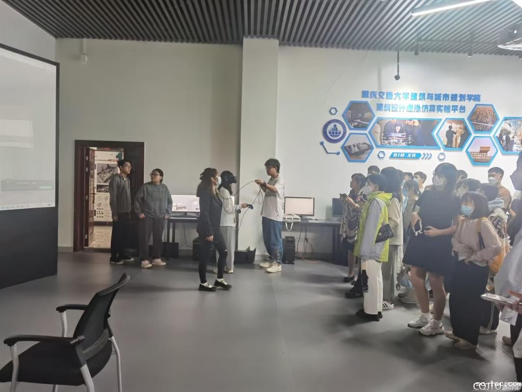 建筑与城乡环境实验教学中心雷怡老师为来访师生介绍我校建筑学专业实验建设情况,同学们还参观了CGB实验室和虚拟仿真实验室,并亲身体会感受了数据孪生技术下VR虚拟现实的奇妙。