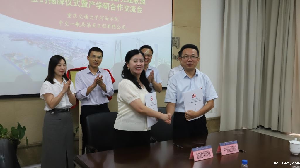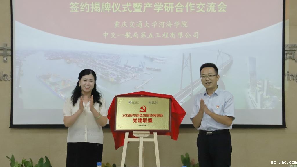 中交一航局五公司党委书记、副总经理宁风华与河海学院党委书记苗金燕代表校企双方共同签署了“水战略与绿色发展协同创新党建联盟”协议书,并为党建联盟揭牌。