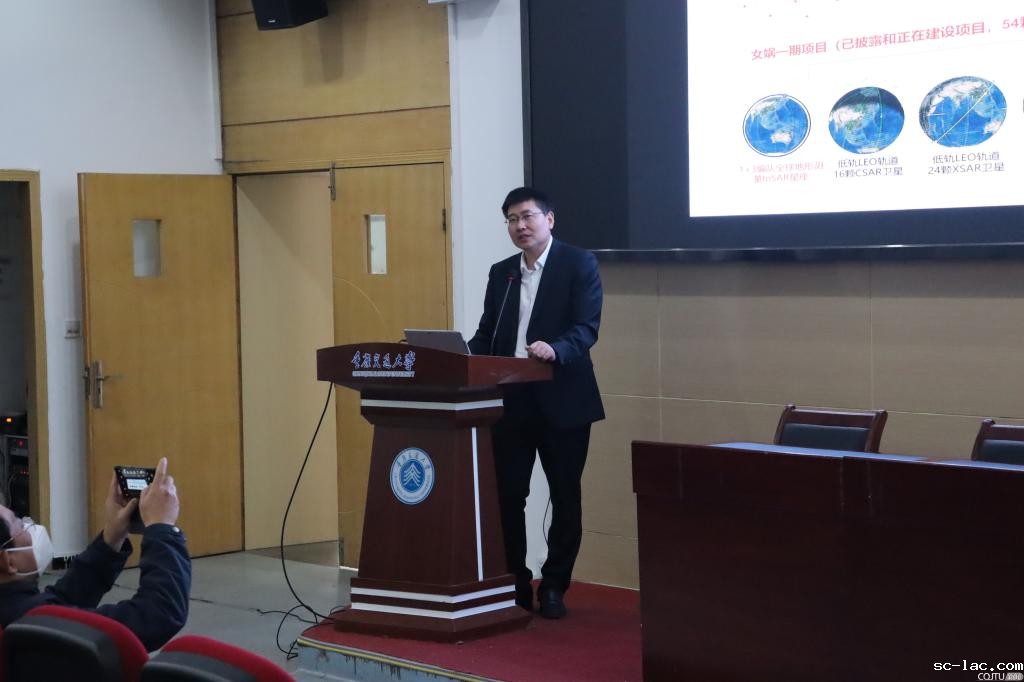 会后,刘东升副总裁还给师生作了题为《构建全球领先融合卫星星座,打造卫星互联网产业新生态》的学术报告。报告介绍了卫星互联网的发展历程、概念内涵和发展趋势,并结合俄乌战争等案例讲解了通导遥复合型应用场景的行业需求,“女娲”融合星座的能力特色、技术体系和发展规划情况等,最后讲解了“女娲”星座基于时空遥感云服务平台PIE-Engine的商业化运营模式以及在全球测绘、自然资源监测评价、应急管理、农林监测等多个领域的应用场景。