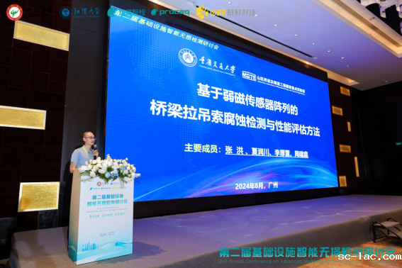 会议期间,我校夏润川副教授代表课题组做了“基于弱磁传感器阵列的桥梁拉吊索腐蚀检测与性能评估方法”学术报告,报告结合桥梁拉吊索的检测需求,从拉吊索内部腐蚀检测方法、弱磁传感器阵列检测装置、拉吊索服役性能评估方法三个方面进行了介绍,另外,针对山区桥梁及隧道工程国家重点实验室的研究平台、开放基金项目申报等做了宣传。该报告为索承桥梁的病害检测、状态评估和换索提供了理论依据和技术支撑,受到了与会专家的广泛关注。