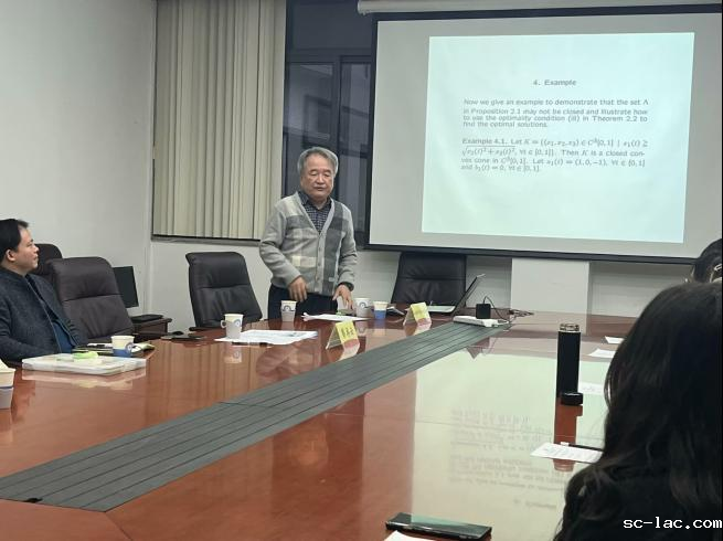 2024年12月15日,应我校向量优化团队邀请,韩国国立釜庆大学Gue Myung Lee教授莅临我校进行学术交流与指导,并举行了“2024优化理论、算法及应用国际前沿研讨会”第三场报告。Gue Myung Lee教授在南岸校区明德楼308会议室作了“涉及积分函数的线性分式优化问题的最优性定理”的专题报告,会议由市创新研究群体带头人、工程数学与力学研究所副所长彭再云教授主持,学院优化理论与应用团队成员及全校相关师生参加了会议。