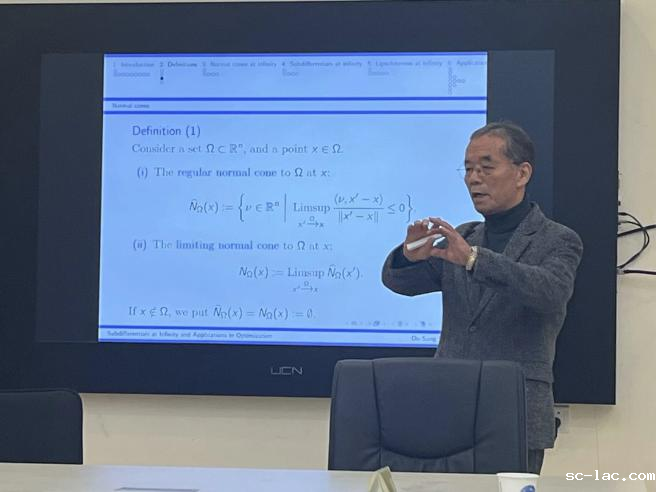会议开始,彭再云教授首先对Do Sang Kim教授、矫立国老师和洪哲老师的到来表示热烈的欢迎,并感谢专家对学院学术团队的指导和帮助。Do Sang Kim教授的报告聚焦于无穷远处的次微分及其在优化中的应用,主要贡献如下:一是定义并研究了无穷远处集合的法锥以及函数的极限和奇异次微分,给出计算规则;二是证明函数在无穷远处是Lipschitz的当且仅当其奇异次微分在无穷远处为