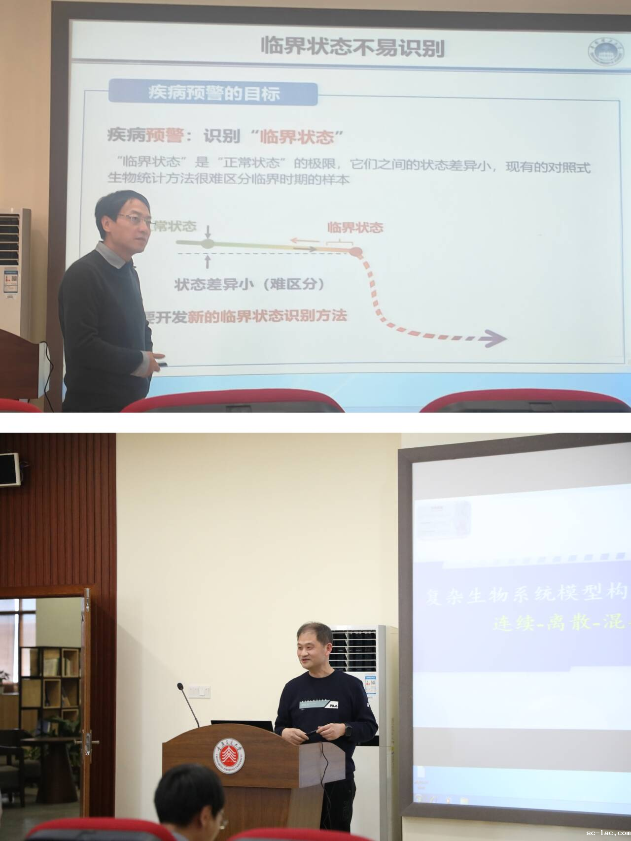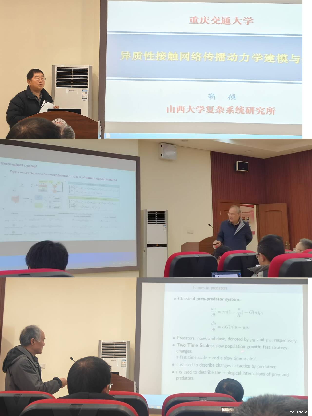 学院生态系统理论及应用团队成员积极参与。会议开始,刘子建教授介绍了本团队的情况及工作进展。会议学术报告阶段,山西大学靳祯教授不仅分享了自己对“重大新发传染病动力学建模与思考”的见解,还呈现了“异质性接触网络传播动力学建模与分析”的详尽报告,讲述了人在时空上包括地理信息和人类特征在内的自然行为会影响疾病的传播,并启发我们思考当基本再生数多大时,控制再生数能够小于1,内容充实且引人入胜;西安交通大学数学与统计学院肖燕妮教授以“Effect of behavior changes on disease transmission dynamics”为题,从数据驱动、模型驱动及最优行为模式三个维度,全面剖析了人类行为改变对疾病传播动力学的影响;天津工业大学雷锦志教授作了题为“结直肠癌进展预测的肿瘤-免疫循环定量模型”的报告,他强调在建模前需深入了解真实的生物背景,明确细胞与组织间的相互作用机理,再据此构建数学模型,并利用现实数据拟合未知参数,以开展真实实验中难以实现的研究;西南大学王稳地教授作了题为“Influences of behavior changes on population dynamics”的报告,深入浅出地阐述了物种行为改变对种群动力学的影响;华南理工大学刘锐教授聚焦于“动力学驱动的复杂系统临界状态预警”,他利用动力学原理,结合神经网络等技术,对复杂系统的临界状态进行预测与警示;山西大学唐三一教授在“复杂生物系统模型构建与理论分析”报告中,提出了一种连续-离散-混杂-连续的创新建模思路,为解决非光滑问题提供了全新的视角。各位专家学者们讲解生动,现场讨论气氛激烈、各抒己见、高潮不断,与我校生态系统理论及应用团队进行了全面而深入的交流与探讨。