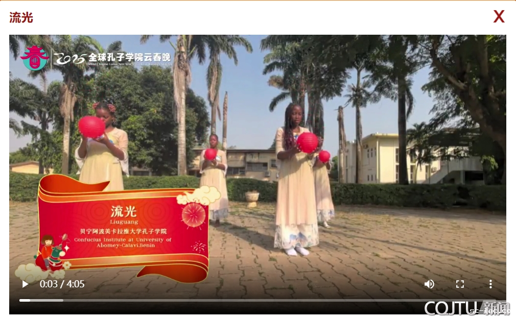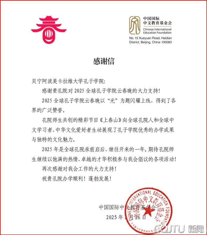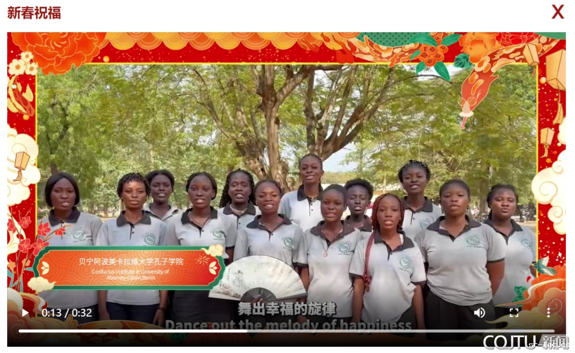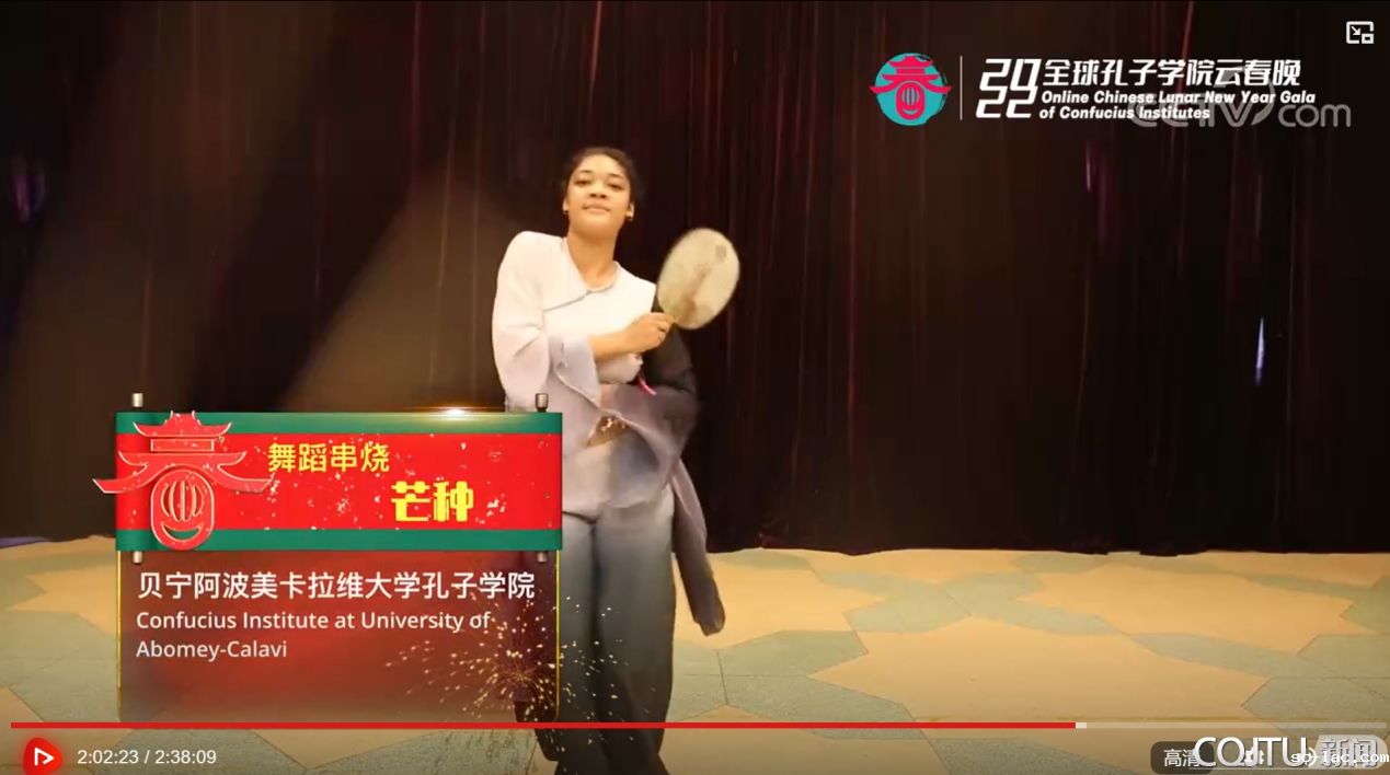 近日,中国国际中文教育基金会向贝宁阿波美卡拉维大学孔子学院(以下简称“贝宁孔院”)发来感谢信,对其在“2025全球孔子学院云春晚”活动中的精彩表现和积极参与表示真挚的感谢。