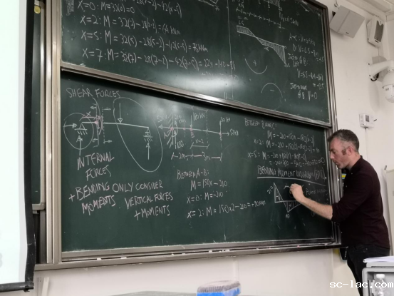 授课期间期间,Finian十分耐心,每一个算例都会与同学们在黑板上一起演算。Finian将理论与实践案例相联系,使同学们能深刻理解力学和结构知识的运用关系。