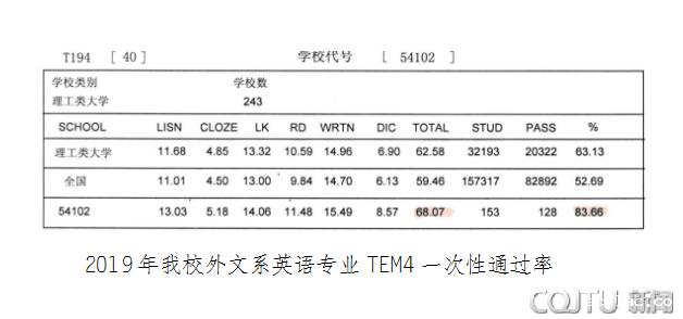 9月26日上午,2019年高等学校英语专业基础阶段TEM4成绩揭晓。外国语学院外文系2017级英语专业学生专四一次性通过率达到83.66%,刷新了外国语学院建院以来专四通过率记录,创历史新高,实现了质的飞跃。此次成绩高出全国综合性大学专四平均通过率(52.69%) 30.97个百分点。其中,13人获得优秀,57人获得良好,优良率高达45.8%。