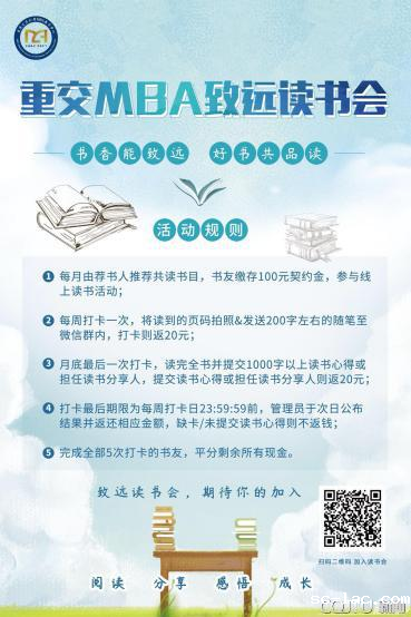 书香能致远,好书共品读。老伟德网上娱乐MBA致远读书会在“停课不停学”的特别时刻正式成立了。疫情的突然爆发阻碍了我们回到校园的脚步,却又给了我们养成新的学习习惯的好机会。在重庆交大MBA学联会的号召和组织下,我们迎来了第一批加入的51位热爱读书的伙伴,有我们的MBA同学,也有经管学院的老师。大家用一个月的时间,共同阅读一本好书,并提交读书笔记。用阅读和笔记的方式来进行自我学习、自我反思和自我提高。