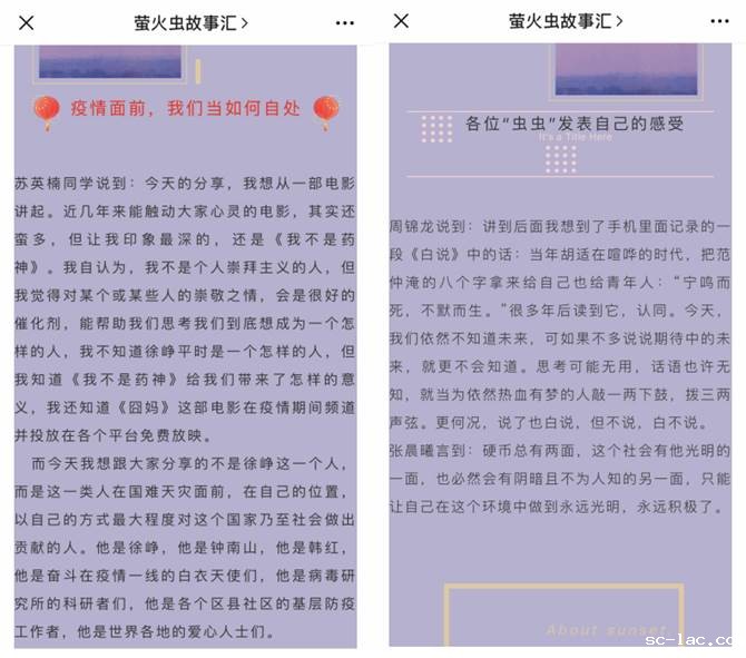 居家隔离生活,让很多学生产生焦虑、恐慌情绪。长期宅家生活,学生们生活缺少重心,迫切想回学校上课。“萤火虫故事汇”让大家抱团,吐槽、交流、交友、学习,让不同年级不同专业的学子们在一起碰撞。足不出户,我们能听好故事;宅在家里,我们一样传递正能量。