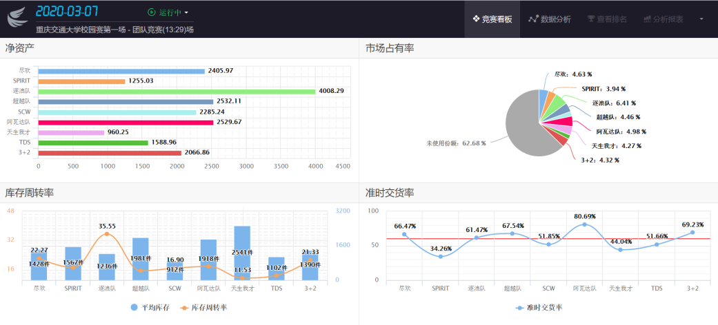 校园选拔赛于2020年3月初启动,由经管学院物流管理系组织,我校共9只队伍参赛,涉及经管院物流管理、工商管理、工程管理、工程造价、市场营销、会计学和交通运输学院交通管理、交越等专业。3月11日开始,共组织进行了8场练习赛(包括季度赛、半年赛和年赛);3月21日至22日,组织进行两场正式赛。李顺勇老师指导的“逐浪队”和申成然老师指导的“超越队”脱颖而出,将代表学校参加全国大赛。