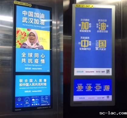 在今年2月份中国疫情的严峻时期,应盛组织动员了“全球同心 共抗疫情”宣传。在全国范围内80个城市近20万部电梯的智慧屏上,每天近6000万次轮播,把联合国副秘书长兼联合国人居署执行主任麦穆娜·谢里夫女士对中国的声援、疫情防控的知识和战胜疫情的信心传播到各个社区。