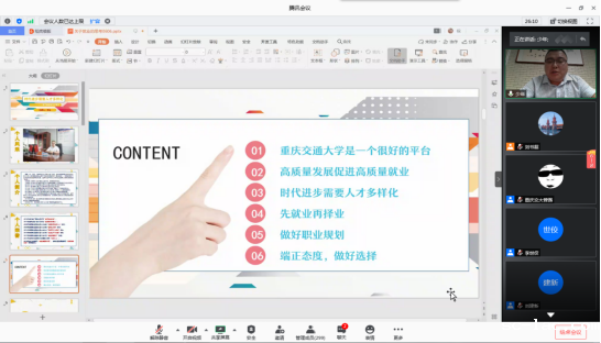 会议伊始,王东校友紧密结合自己从业十多年来的工作历程和感悟体会,针对行业、职业、学科专业以及学生的现实困境,从交大是一个很好的平台、高质量发展促进高质量就业、时代进步需要人才多样化、先就业后择业、做好职业规划、端正态度做好选择六个方面,进行了非常系统、深入并且专业的解读,既有理论的深度也有落地的温度,既有行业发展的战略需要,也有就业择业的现实需求。特别是针对学生们在职业规划、就业选择过程中常见的问题,给出了自己的一些建议,他认为自我评估全面、职业探索深入、职业目标清晰和行动计划详尽这四大方面对同学们而言是十分重要的。同时,也殷殷勉励学弟学妹们珍视机遇、把握平台、主动作为,立大志、担大义、成大器、建大业,用拼搏实干赢得主动、赢得优势、赢得未来。
