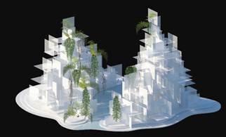 城市将随着科技与人居环境空间变化而发展,未来城市与生命的融合可以像热带雨林一样,能够为更多的动植物提供栖息空间,而不仅仅是人类。未来,城市也能够像雨林一样为地球的生态循环起到良好的作用。作品提取重庆山地地形、两江四岸、建筑形态等元素,融合城市森林的理念,营造城市雨林秘境。