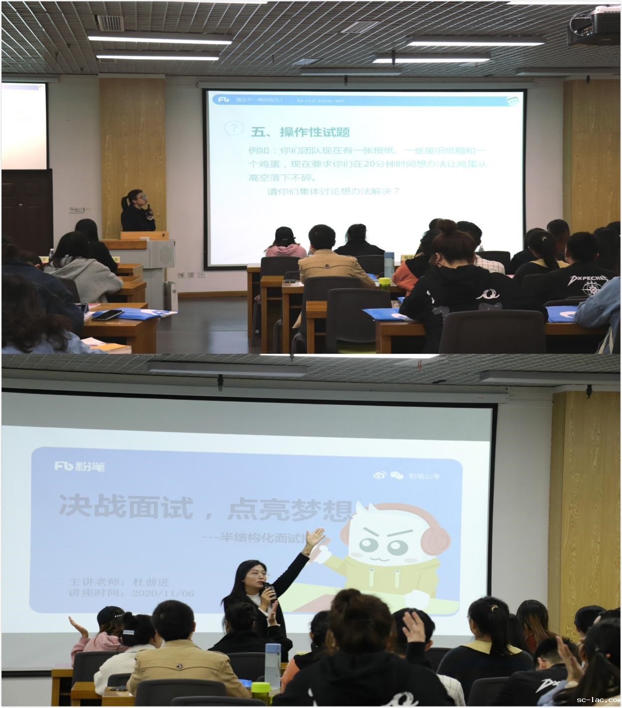 培训老师重点围绕无领导小组讨论和半结构化两种面试形式为同学们做了培训。首先粉笔教育葛琴老师从无领导小组讨论面试是什么、怎么考、如何得高分三部分进行了讲解,尤其是在如何得高分部分,葛老师分别从评分要点、面试官喜好、角色选择、有效应对突发情况等角度,为同学们分享了很多实用技巧。其次,粉笔教育杜前进老师从半结构化面试怎么考、怎么准备两个部分进行了讲解,重点围绕自我介绍、岗位认知、求职动机、职业规划为大家讲解了出题方式及答题技巧,最后杜老师还围绕“如何有效应对面试官的追问”给同学们分享了实用技巧。活动过程中,同学们积极回答培训老师所提问题,现场氛围活跃。