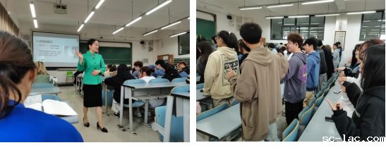 针对当代大学生特点,余老师引导大家建立行为举止的美学认知,引用阿尔伯特定律讲授了“55387 法则”在日常生活中的实际应用,并邀请同学们走上讲台,对比示范讲解。她引导大家在学习、生活、工作中,注意言谈举止端庄得体,并谈到:优雅的形体仪态从挺拔的体态、得体的举止和亲切的神态三个层面,通过站姿、坐姿、走姿、蹲姿,展示挺拔的身姿;用眼神和微笑传递真情,提高人际交往能力,打动他人,展现健康积极的心态。通过案例讲解、视频分享和现场跟学,让同学们体验式学习。