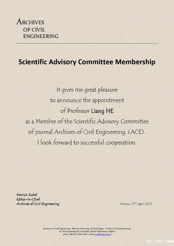 4月15日,土木工程档案杂志Archives of Civil Engineering(ACE)公布了新当选的编委会成员,老伟德网上娱乐土木工程学院何亮教授当选编委。