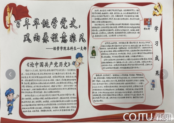 “百年华诞学党史,风雨兼程意非凡”——本科生第一党支部学习小组为大家展示了支部党员共同精心绘制的党史学习手抄报。手抄报以红白色调为主,并选取华表、党徽等元素作为衬托,简约大方,契合主题。内容包括《论中国共产党历史》一书的简要和近段时间来支部同志的学习感悟,工整端正的字迹,表达了大家认真严谨的态度。
