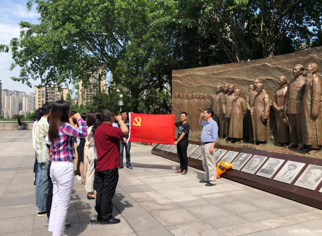 在组织员游宇同志带领下,党员们在红岩广场前面对党旗庄严地举起右拳,重温入党誓词:“我志愿加入中国共产党,拥护党的纲领……”