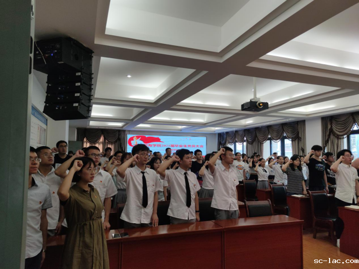 毕业生党员代表发言结束后,由石玲老师带领全体毕业生党员重温入党誓词。党员们举起右手,面向党旗,郑重的念着誓词。掷地有声的誓言表达了大家为党的事业奋斗终身的理想信念和时刻以党员标准严格要求自己的坚定决心。