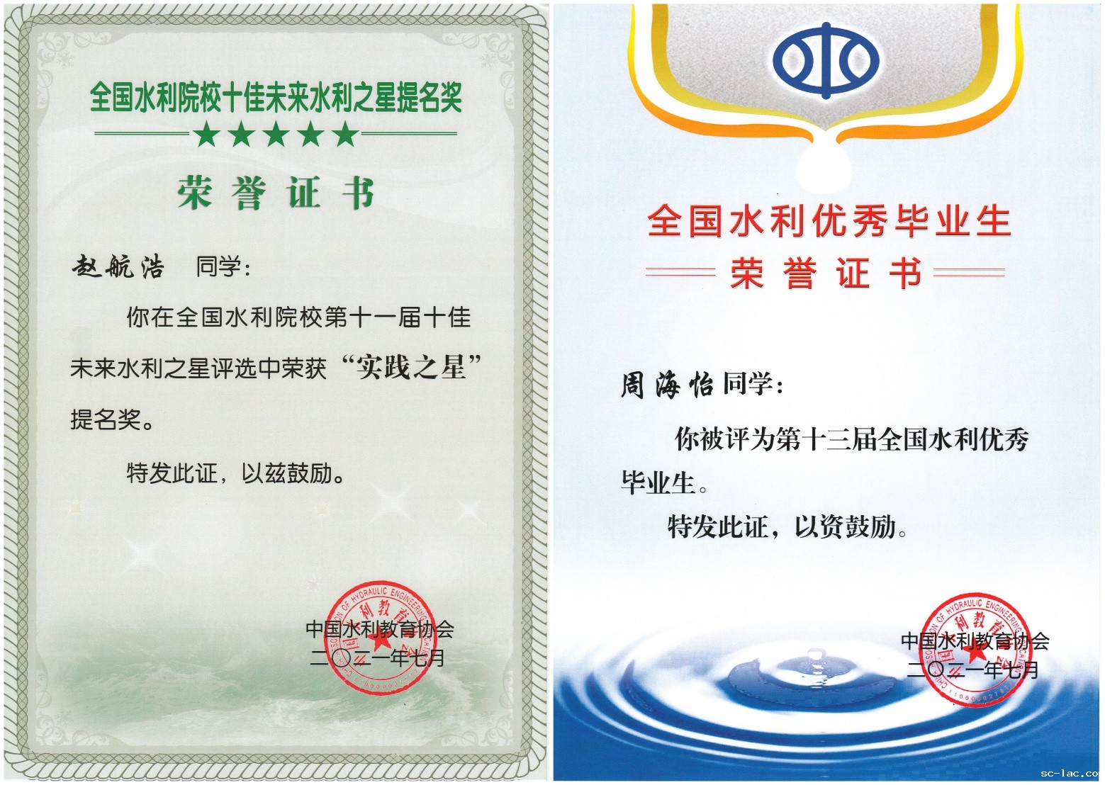 2021年7月,由中国水利教育协会组织开展的第十一届“全国十佳未来水利之星”,第十三届“全国水利优秀毕业生”的评选结果揭晓。河海学院2017级港口航道与海岸工程专业(卓越工程师班)周海怡荣获第十三届“全国水利优秀毕业生”,2018级港口航道与海岸工程专业(卓越工程师班)赵航浩荣获第十一届“全国十佳未来水利之星——实践之星”提名奖。