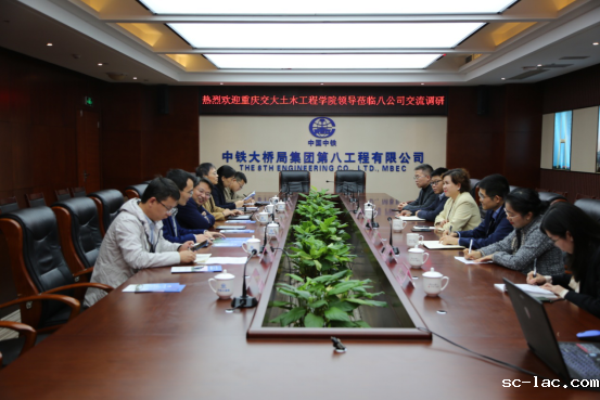 舒书记一行首先观看了中铁大桥局企业宣传片,详细了解了中铁大桥局的发展历程和辉煌成就。八公司副调研员李德坤介绍了公司的科研现状和技术需求,希望加强与学校科研合作。八公司人力资源部部长刘浩向舒书记一行详细介绍了八公司的企业发展、在建项目及人才需求等情况,重点就重庆交大校友在八公司的成长情况作了详细介绍。他强调,近年来,重庆交大向八公司输送了一大批优秀的人才,经过锻炼已经成长为八公司中坚力量,更有部分校友已经走上领导岗位。在以后的发展中,公司期望能够吸纳更多优秀的重庆交大毕业生加入,双方共同成长、共同进步,建立更加密切的联系。