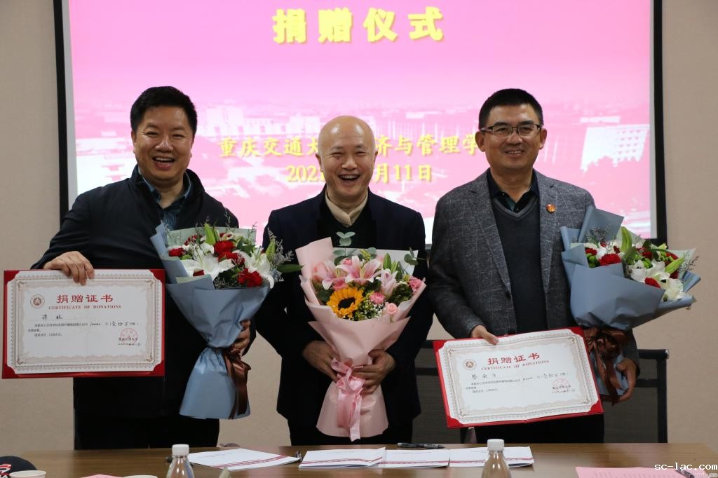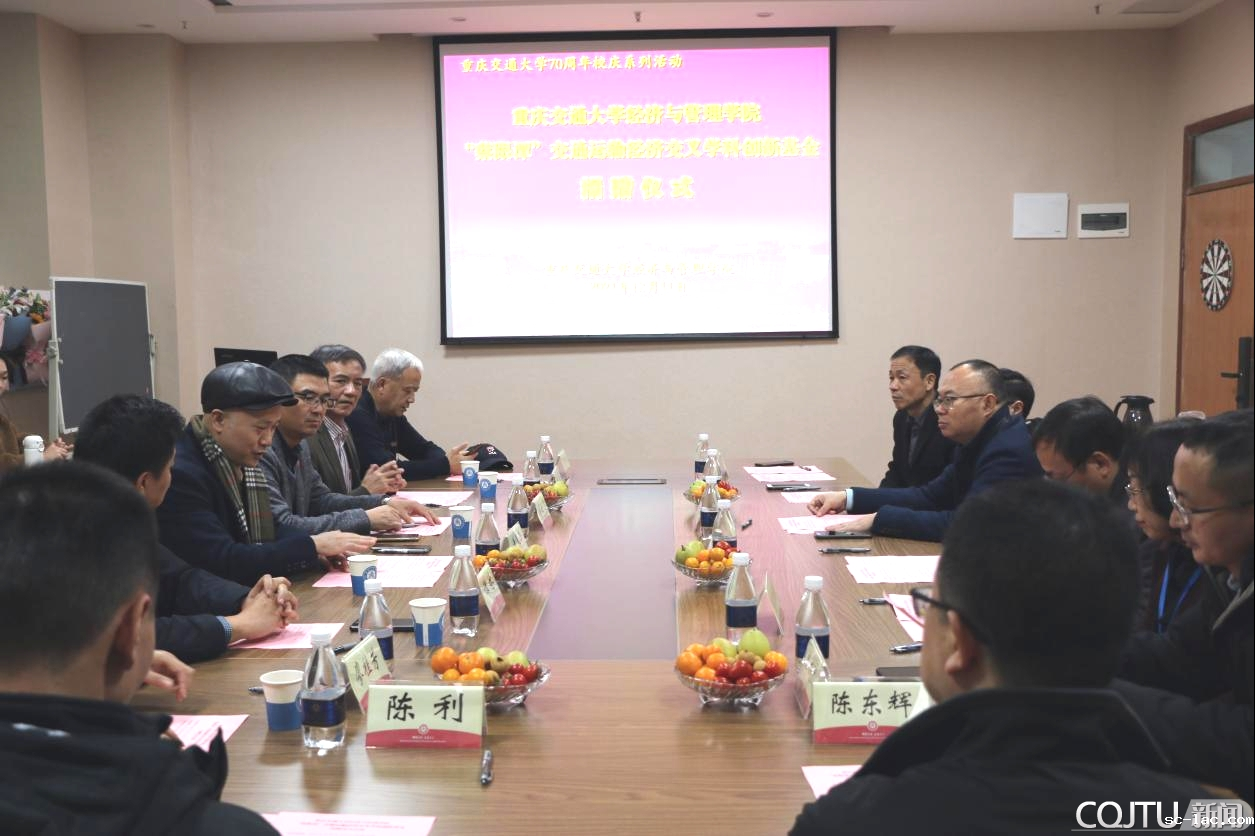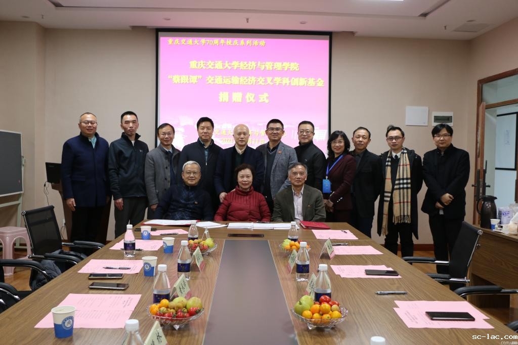 2021年12月11日下午,经管学院于南岸校区明德楼会议室举行“蔡跟谭”交通运输经济交叉学科创新基金捐赠仪式,黄承锋副校长,广州市大楚物流有限公司董事长蔡云飞、苏州隆力奇东源物流股份有限公司总经理谭林、重庆市公安局九龙坡局分局调研员陈东辉、重庆轮船(集团)有限公司副总经理陈利等嘉宾出席,经管学院领导班子、荣休教师、师生代表参会,会议由石超峰副院长主持。