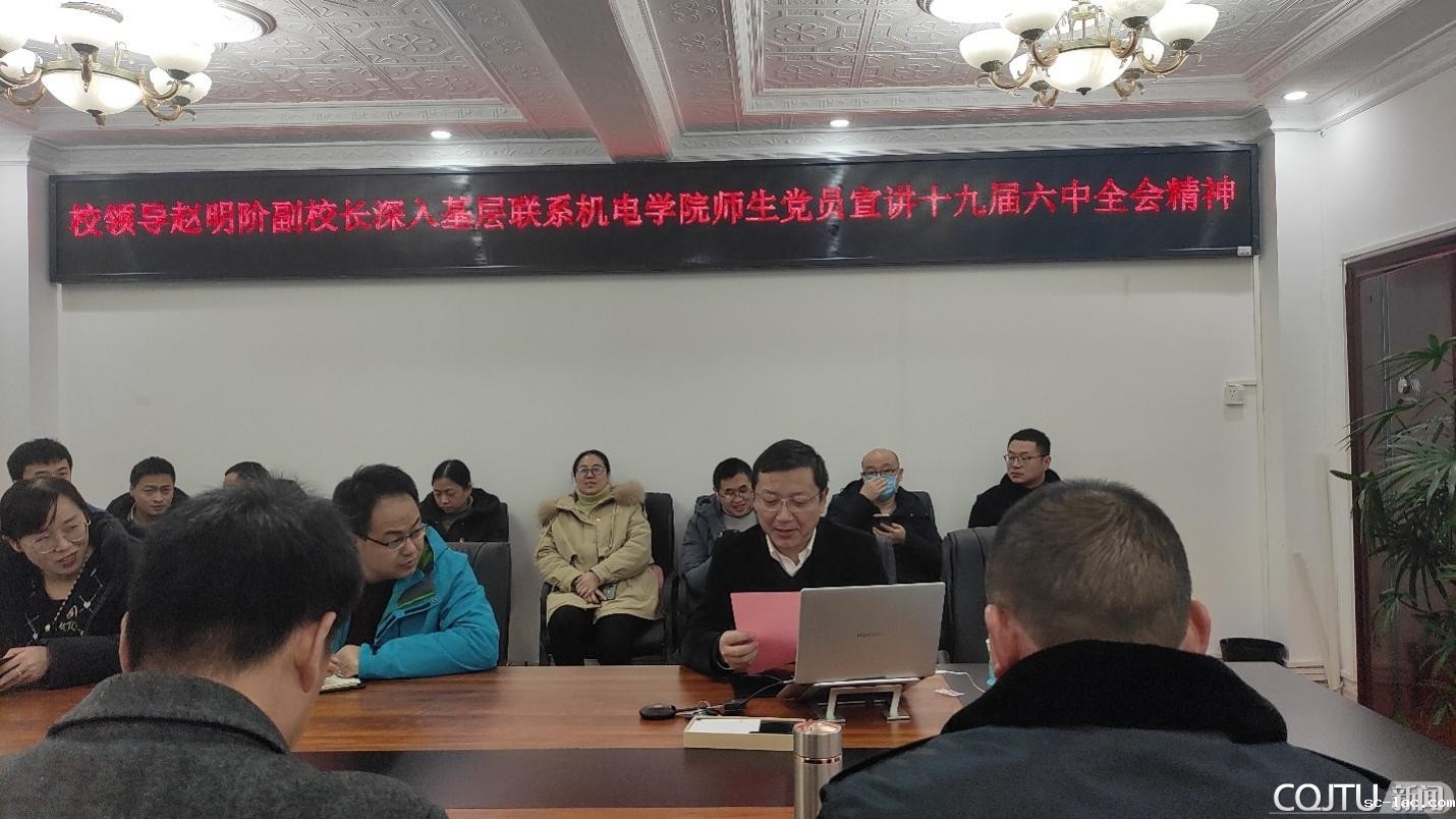 为深入学习贯彻党的十九届六中全会精神,根据学校党委统一部署安排,2021年12月31日下午,副校长赵明阶到机电学院作宣讲报告,机电学院班子成员、教师党员和学生党员代表参会。宣讲报告主题鲜明、内容丰富、逻辑严谨,既有政治高度、又有实践深度,具有很强的针对性和指导性,对于深入学习贯彻党的十九届六中全会精神、扎实推进高校党史学习教育、切实推动学院学科专业发展具有重要的指导意义。