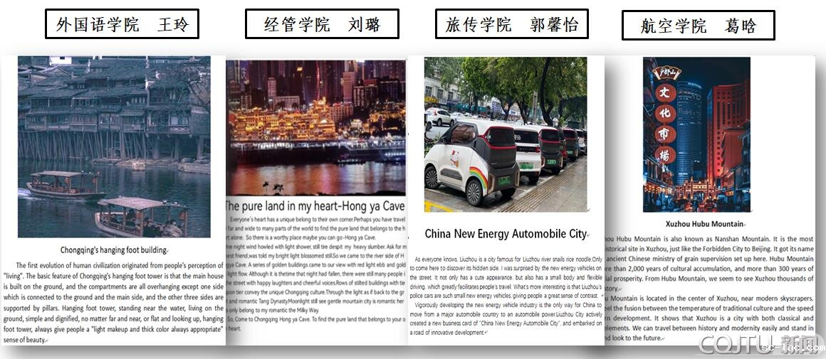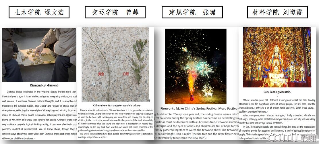 活动收到了来自外国语学院、土木学院、交通运输学院、材料学院、经管学院、旅传学院、航空学院、建规学院等学院学生的实践作品百余份。同学们的拍摄视角涵盖了中国新年、民俗文化、人文景点、百姓生活、科技发展等,充分展现了正能量的中国面貌。下图为部分优秀学生实践作品截图。