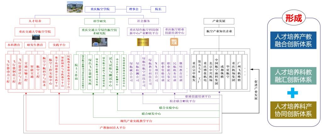 初步构建了产教、科教,科产共通共融的多元协同育人平台——汇聚政校企行各方优质资源,构建了包括重庆市通用航空协会(理事长单位)、中国航空教育学会(理事单位)、中国兵工学会(理事单位)、绿色航空科技(重庆)有限公司(全资公司)、重庆绿色航空科技创新中心(重庆市众创空间)、全国工业无人机行业产教融合共同体(副理事长单位)、全国航天高端装备制造行业产教融合共同体(副理事长单位)、低空经济创新发展联盟(会员单位)、无人机创新人才培养联盟(会员单位)等在内的产教融合平台。