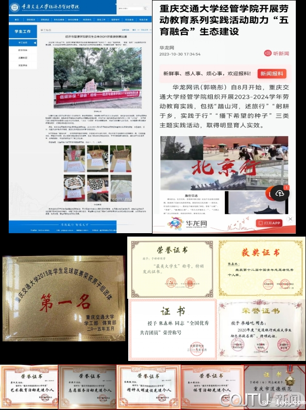 将美育、劳育等作为“三全育人”综合改革和“大思政”工作格局的重要载体,加强制度设计、组织保障和资源统筹,拓展校内外实践平台,鼓励引导学生投身劳动实践和美育创新,实现“以劳树德”“以劳强志”“以劳健体”“以劳育美”的工作目标,不断提升育人实效,助推学生全面发展,先进做法获得重庆市主流媒体的多次报道。