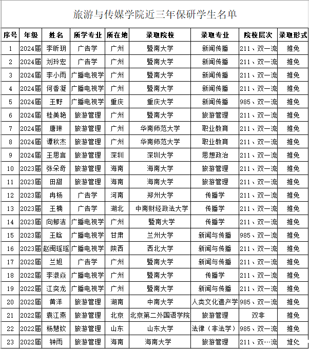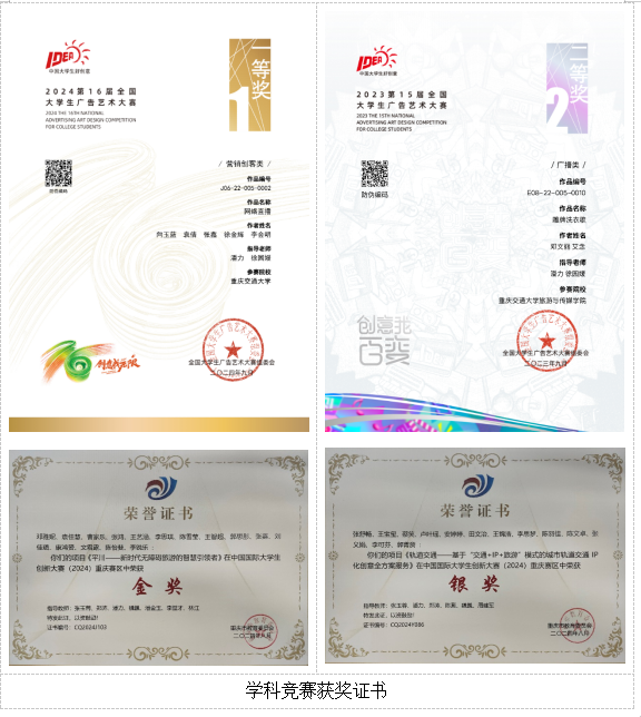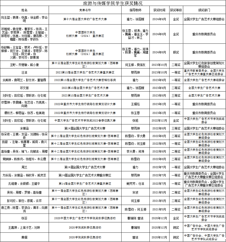 在整个“文旅+交通”人培养体系架构下,人才培养质量稳步提升,社会评价与办学美誉度获得提升。相关专业毕业生就业率连续多年超过90%,就业质量不断提高。同时,学院引进了相关文旅和交通行业部门企业招聘学生,毕业生“文旅+交通”行业企业就业率不断提升。学生保研和考研人数逐年增多,多人进入国内外高水平大学攻读硕士学位。学生积极参加相关学科竞赛,团队获得全国大广赛金奖、学院奖金奖、中国国际大学生创新创业大赛重庆赛区金奖、重庆大学生旅行线路创意策划设计大赛一等奖等奖项150余人次。专业建设成就得到政府和社会认同,获得重庆市教学成果奖三等奖,中国软科专业排名,旅游管理专业获评A,广播电视学、广告学和汉语国际教育获评B+。