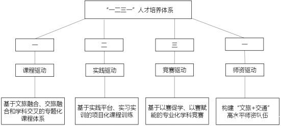 “一”是课程驱动,即基于文旅融合、交旅融合和学科交叉的专题化课程体系。以培养符合新时期国家建设和社会发展需要的高素质有特色“文旅+交通”人才为引领,通过学科整合重塑课程体系和教学内容,革新人才培养模式。融合新闻传播、旅游管理、汉语教育、交通文化、交通管理和交通经济等相关学科专业内容,设置“文旅+交通”教学模块。“二”是实践驱动,即基于实践平台、实习实训的项目化课程训练。构建央地共建、校地合作的多层次“文旅+交通”实践平台和实训机制,整合校内教育科研创新平台、开展校校实践训练和注重理论教学与社会实践等。积极推动项目式教学改革,增强学生的实践动手能力。“三”是竞赛驱动,即基于以赛促学、以赛赋能的专业化学科竞赛。围绕“文旅+交通”创建跨学科竞赛团队和“3+3+X”多层次竞赛体系。包括参加3项校级选拔性竞赛,3项全国性或区域性竞赛,以及选择性参加校内外相关竞赛,形成由低到高、循序渐进的“以赛促学”驱动模式。近年,积极组织和支持师生参加中国国际大学生创新大赛、大学生广告艺术节、学院奖及全国红色旅游策划大赛等高级别和有影响力的学科竞赛。“一”是师资驱动,即构建“文旅+交通”高水平师资队伍。融汇本校文化和交通类相关专业师资,鼓励专任教师赴相关文旅和交通企业挂职锻炼,推进“校外导师进课堂”工程。