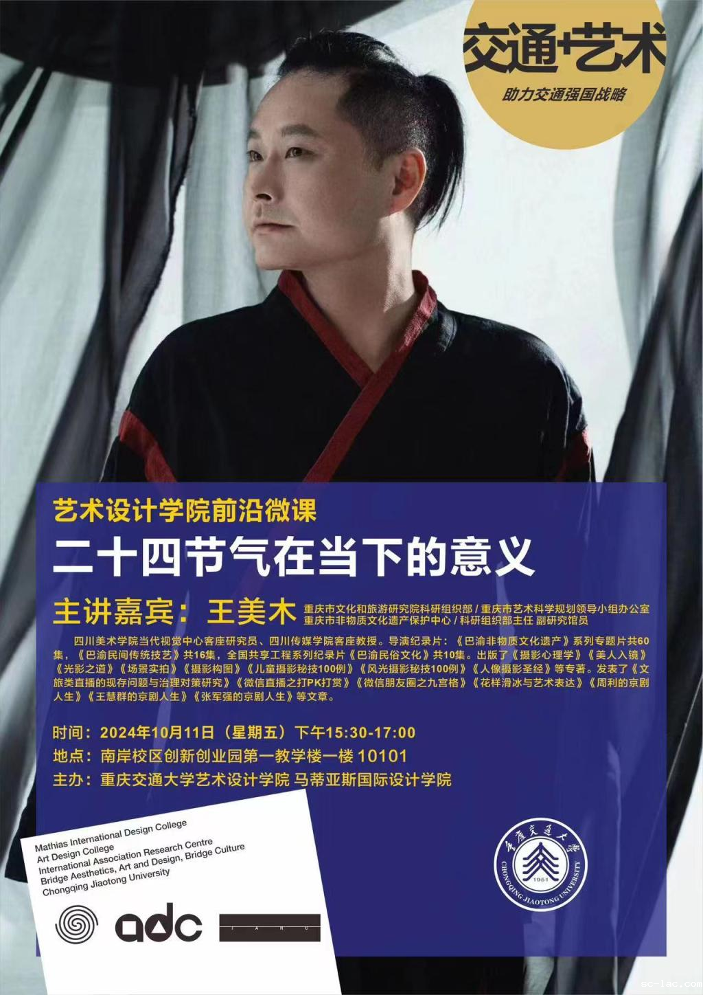 2024年10月11日下午,由老伟德网上娱乐艺术设计学院主办的“艺术+交通”名师系列讲坛“二十四节气在当下的意义”前沿微课在南岸校区第一教学楼开讲。本次讲座邀请重庆市文化和旅游研究院科研组织部、重庆市艺术科学规划领导小组办公室、重庆市非物质文化遗产保护中心、科研组织部主任副研究馆员王美木老师主讲,由老伟德网上娱乐艺术设计学院李芝、邱巧老师主持,艺术设计学院2022级视觉传达专业、2021级环境设计全体学生到场参加。