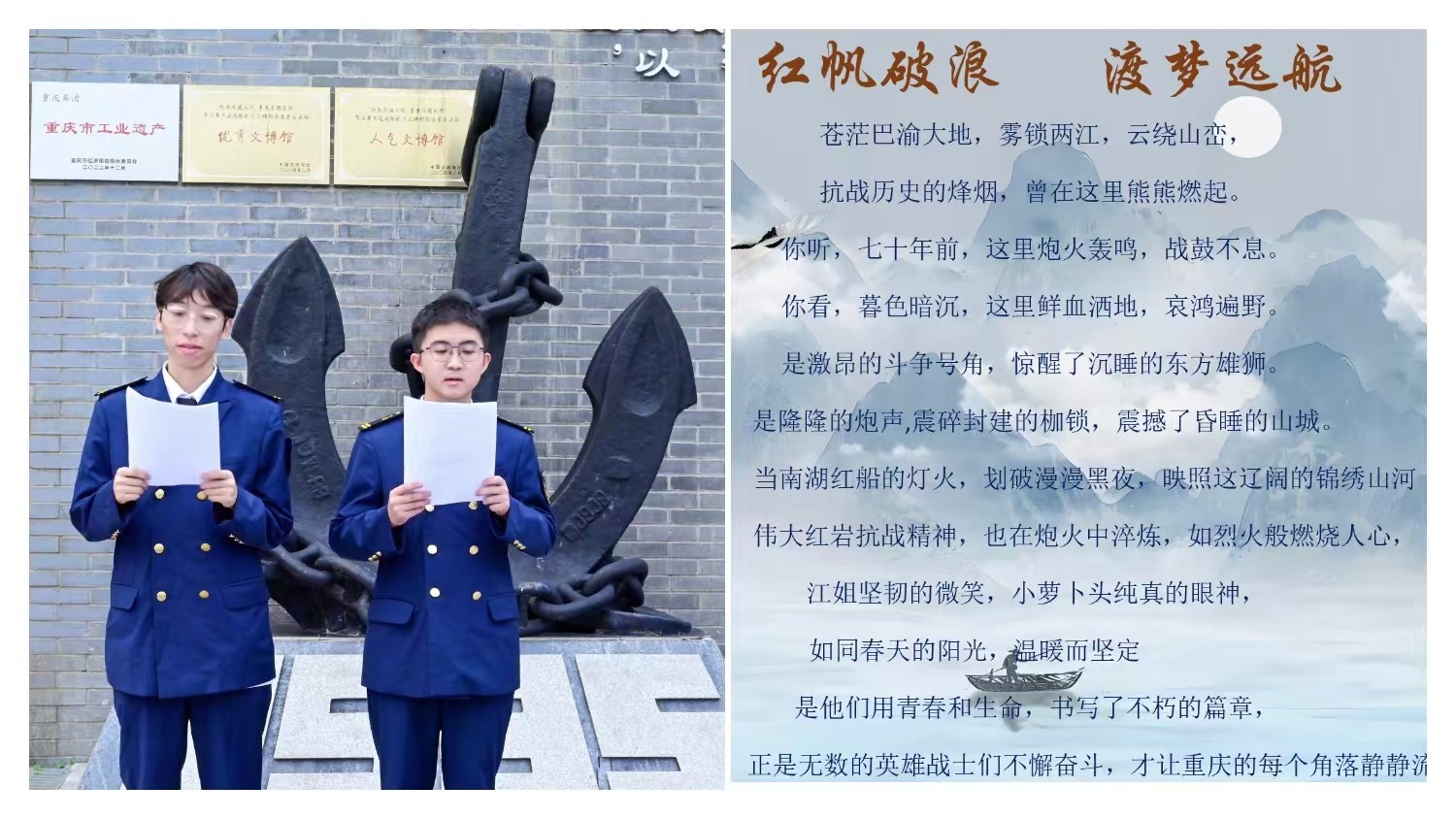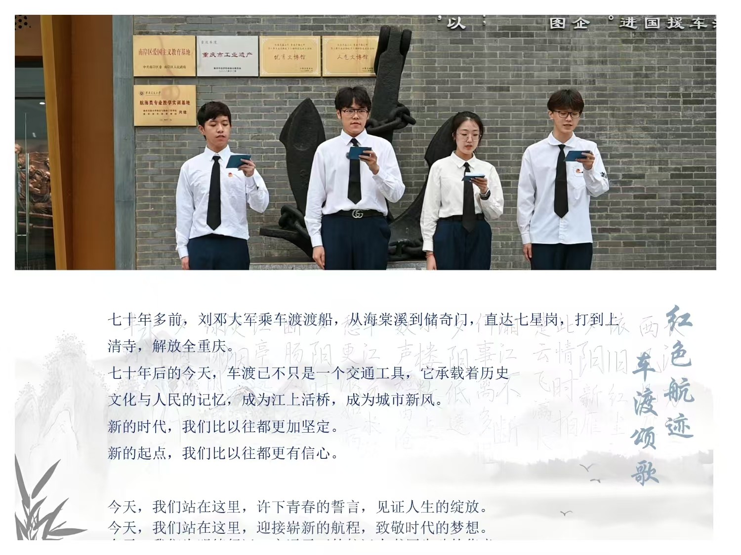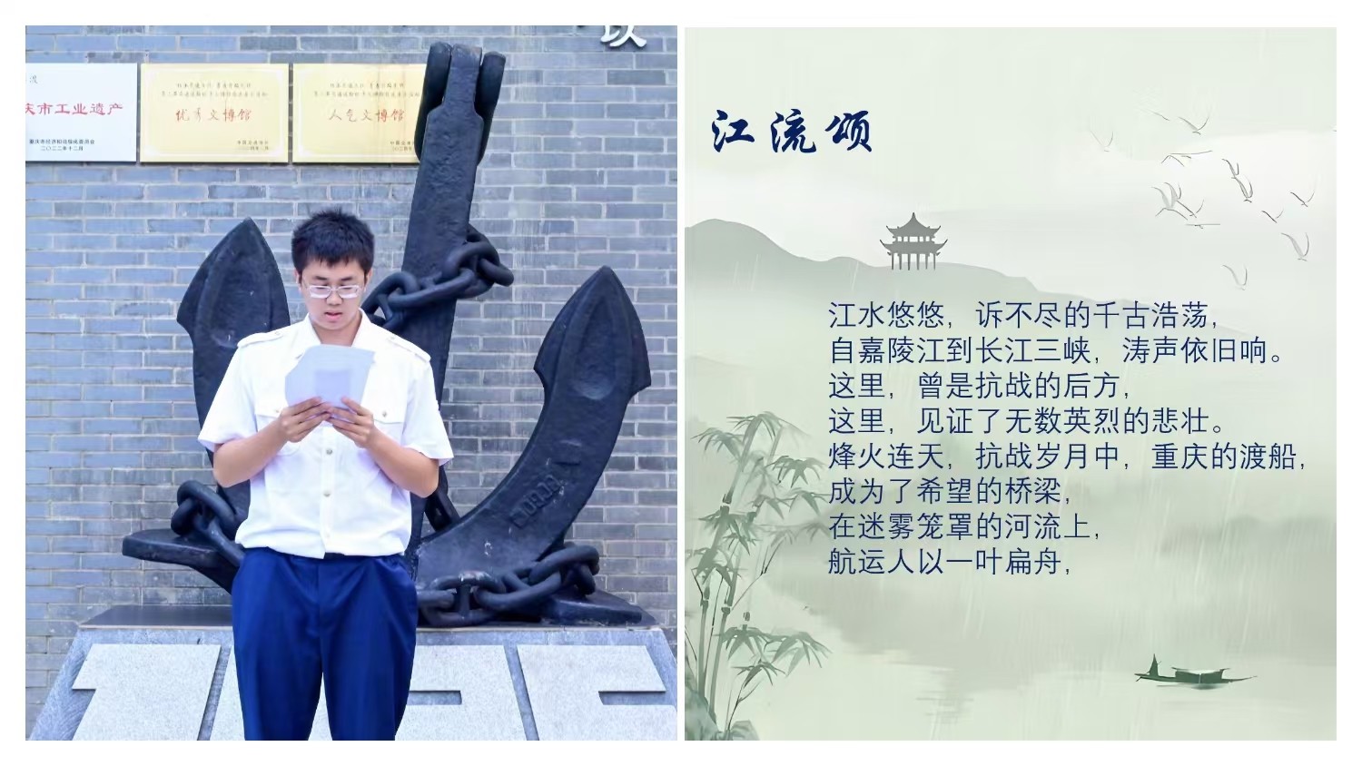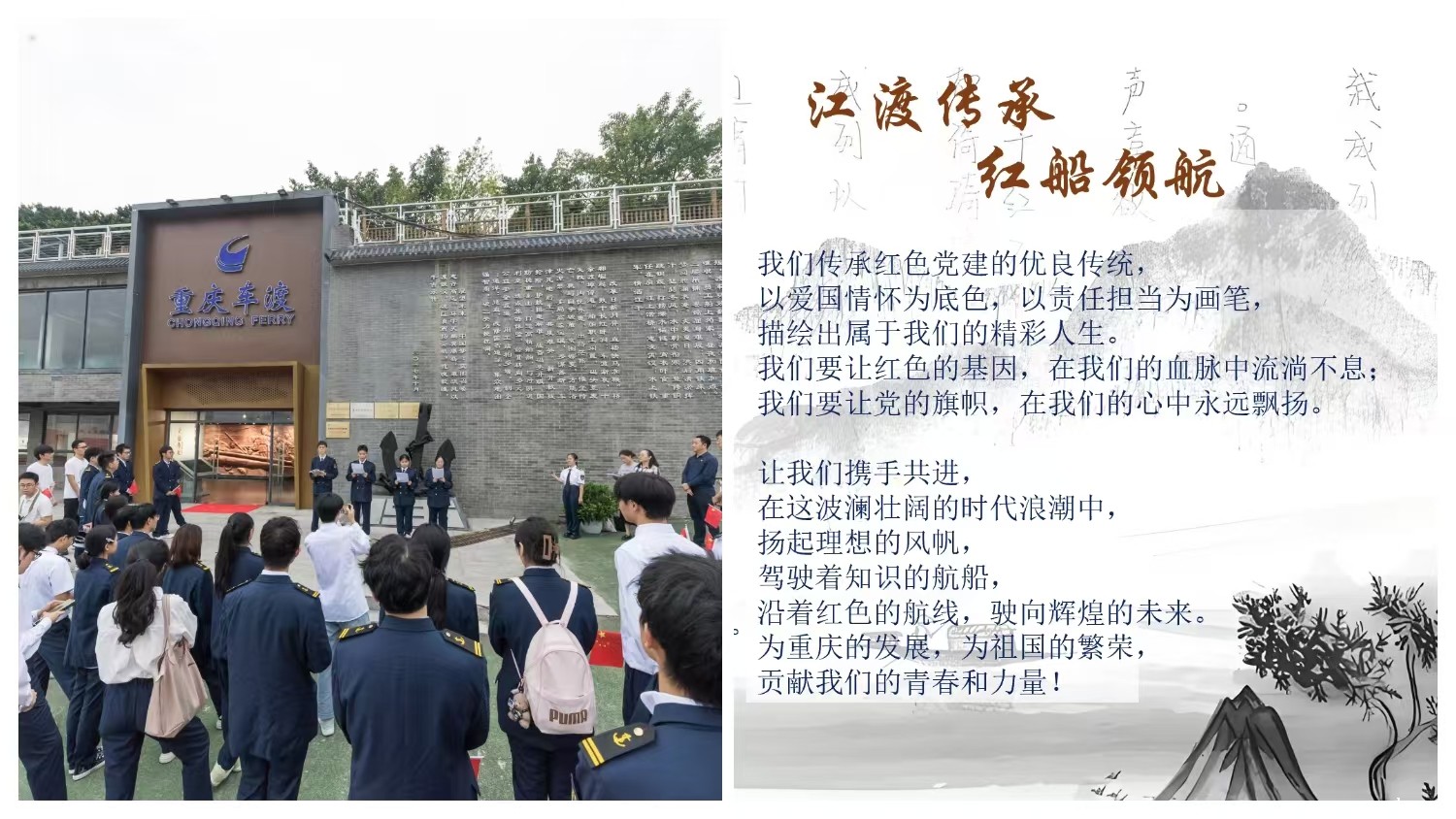 研究生支部甘爽带来的《江流颂》中指出“烽火连天中,重庆的渡船成为了民族的桥梁,航运人以一叶扁舟,运送的物资、生命与信仰,肩负着民族的脊梁。这次研学不仅了解到了车渡船在航运史上的重要地位,更深刻体会到了它作为连接过去与未来的桥梁,对于培养自己的历史文化素养、爱国情感和社会责任感都具有独特的教育意义。”