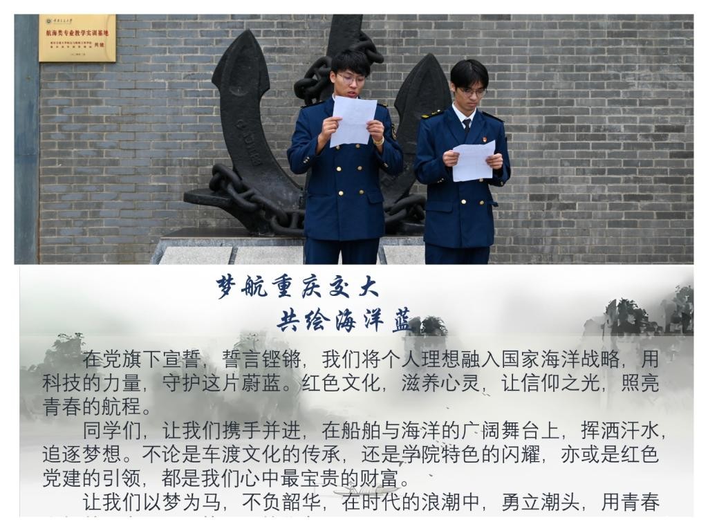 本科生第一党支部武王博、张灵灿带来的《梦航重庆交大,共绘海洋蓝》中表明:“车渡精神不仅是重庆的历史记忆,更是我们青年一代的精神财富。我们要以车渡精神为指引,坚定理想信念,锤炼过硬本领,为实现海洋强国战略贡献自己的力量。”