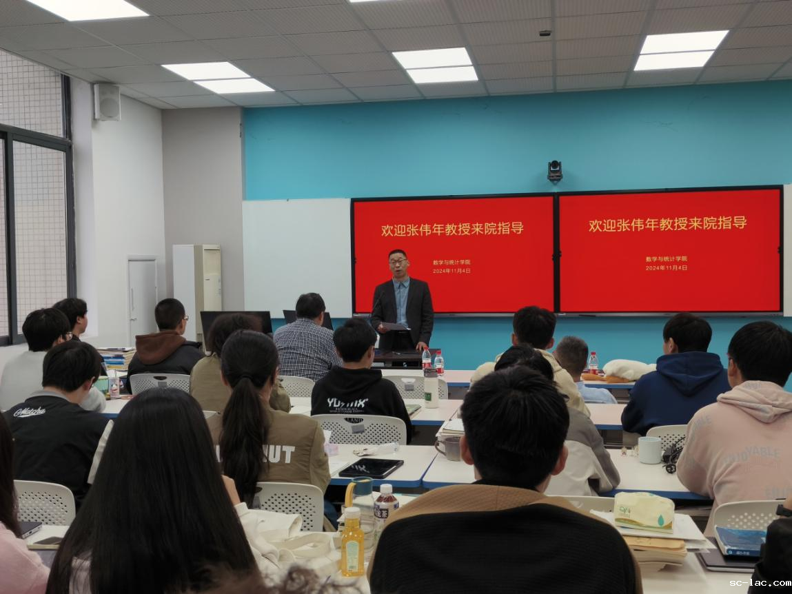 2024年11月4日,数学与统计学院在科学城校区A01429教室举办了一场别开生面的专题讲座。四川大学张伟年教授以“数学之美”为主题,为数学拔尖人才基地班的全体学生讲授了精彩一课。讲座由数学与统计学院王其林院长主持,学院部分专业课教师和学生一起聆听了报告。