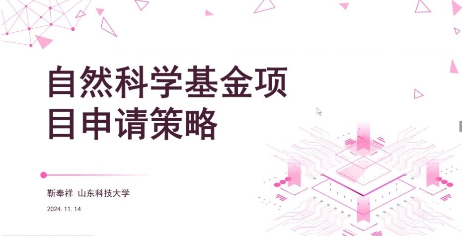 为落实学校、学院2025年国家自然科学基金项目申报推进会的相关精神,进一步提升学院教师2025年国家自然科学基金的申报质量,做好申报书撰写工作,11月14日,智慧城市学院特邀山东科技大学靳奉祥教授线上开展国家自然科学基金申报辅导工作,会议由学院副院长唐菲菲教授主持,学院院长蔡晓禹教授、学科办主任朱康文副教授、教师骨干、青年教师参加会议。