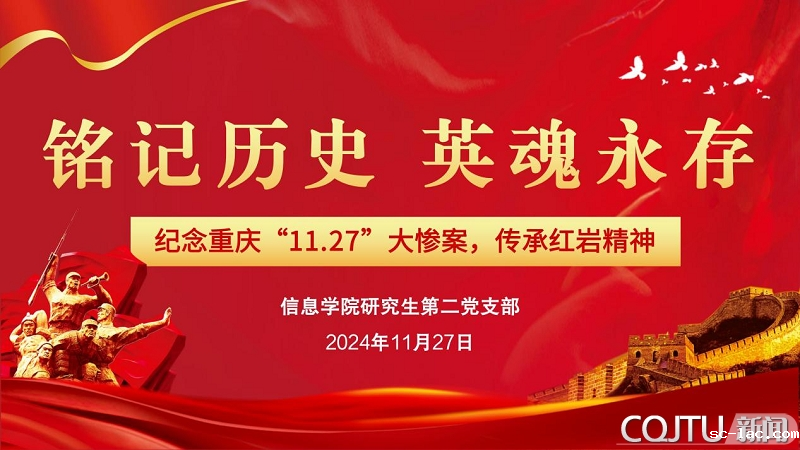 在重庆“11.27”大屠杀惨案发生75周年之际,为深刻铭记历史,缅怀革命先烈,传承红色基因,弘扬红岩精神,信息学院研究生第二党支部于11月27日,在语音楼90910会议室开展了一场以“铭记历史,英魂永存”为主题的学习座谈,旨在通过回顾历史,激发党员的爱国情怀与责任担当,让红色精神在新的时代继续发光发热。