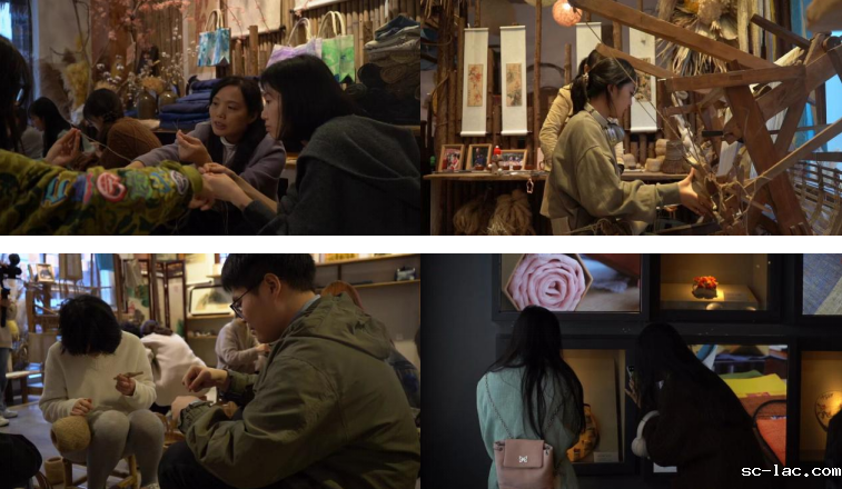 走进壹秋堂夏布坊,学生们见识了用夏布织就的各类产品,工作人员介绍了夏布的优异功能,并列举了不同品类质感的布匹适合用于哪些产品的制作。在考察过程中,工作人员向同学详细讲解并示范了夏布的几个重要织造环节,学生们亲身体验了从绩纱、挽芋子、穿扣到织布的四个织造过程,每一个步骤都需要精细的手艺和耐心的等待。