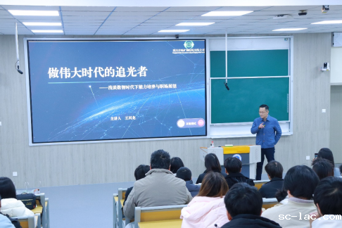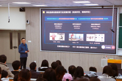 王丙龙书记以“做伟大时代的追光者”为题,深入浅出介绍了测绘行业的发展历程,王书记提出:“如今,世界发生快速变革,人工智能、智能制造、智慧城市等领域的高速发展,颠覆着传统的产业布局,大学生应全面打开视角与思维方式。”这一观点引起了在场同学们的深思。