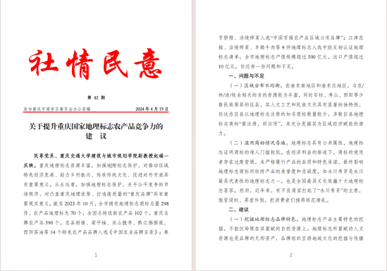 民革党员赵瑞一则在社情民意建言中,提出了《关于提升重庆国家地理标志农产品竞争力的建议》。他强调了提升地理标志农产品竞争力对于促进重庆农业高质量发展的重要性,建议通过品牌建设、市场推广等方式提高产品附加值。