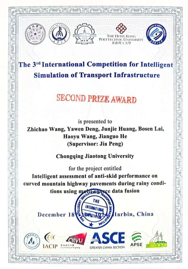 该作品由彭佳老师指导,王智超、邓雅文、黄俊杰、赖博森、王浩宇和何建国6名学生组成的团队共同完成。决赛中全程使用英文陈述和介绍了作品内涵,并根据评委现场提问进行答辩。作品“Intelligent Assessment of Anti-skid Performance on Curved Mountain Highway Pavements During Rainy Conditions Using Multi-source Data Fusion”立足重庆山城特性,通过对山区道路进行实地考察、检测,深入剖析山区道路事故多发原因,提出构建“轮胎-水-路面”三体动态耦合抗滑模型来仿真得到路面抗滑性能衰变规律,并建立可变限速数据库,架构多维数据融合的山区公路弯道智能可变限速预警系统,为山区交通安全保驾护航,推进交通基础设施智能化和社会治理水平现代化。