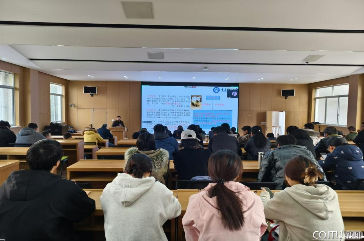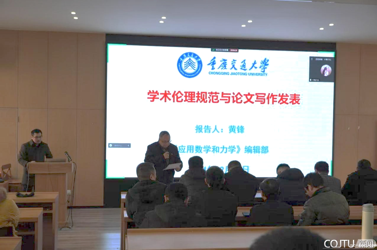 12月26日下午,材料科学与工程学院师德师风专题教育暨材料·青春之约系列讲座第四十三讲在南岸校区一教10301报告厅举行。本次讲座邀请我校《应用数学和力学》编辑部主任黄锋作题为“学术理论规范与论文写作发表”的学术报告。会议由材料科学与工程学院党委书记周平主持,学校全体教师和南岸校区研究生现场参会,科学成校区研究生线上参会。