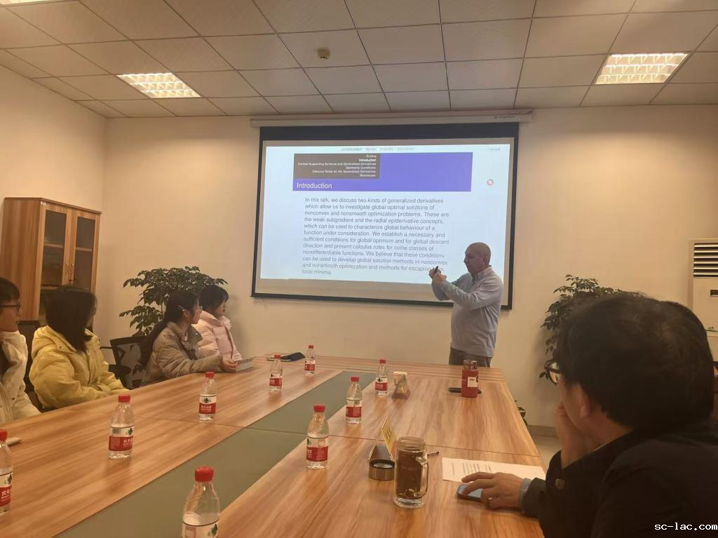 交流会中,Refail Kasimbeyli教授由浅到深地介绍了导数和广义导数在优化理论中的作用,解释了如何在凸和非凸优化中使用导数概念来建立最优性条件。报告中,他介绍了一些导数的推广,如方向导数、次微分、Clarke导数、Rockafellar次导数、Kasimbeyli弱次微分和径向上图导数等概念。另外,从径向上图导数的角度分析了非凸优化中全局最优解和全局下降方向的充要条件。在报告中,Kasimbeyli教授用到一些简单的例子直观展示了径向上图导数的定义和一些性质。 师生们对报告内容产生了浓厚的兴趣,积极与教授互动和交流。
