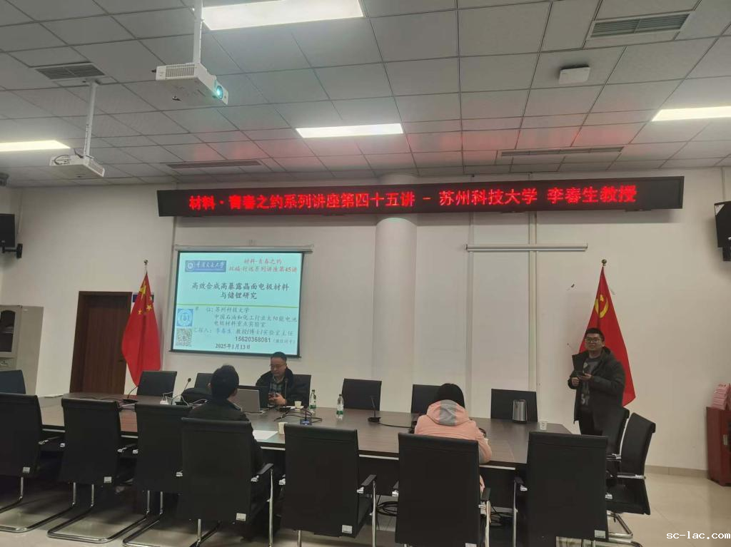 1月13日,材料·青春之约系列讲座第四十五讲在科学城校区材料科学与工程学院会议室成功举办,邀请苏州科技大学李春生教授作题为《高效合成高暴露晶面电极材料与储锂研究》的学术报告。本次讲座由材料学院青委会委员胡兵兵副教授主持,学院骨干教师和部分研究生参会。李春生教授以其深厚的学术功底、丰富的科研经验,以及对锂电池研究领域前沿问题的深刻见解,为师生们带来了一场精彩纷呈的学术分享。